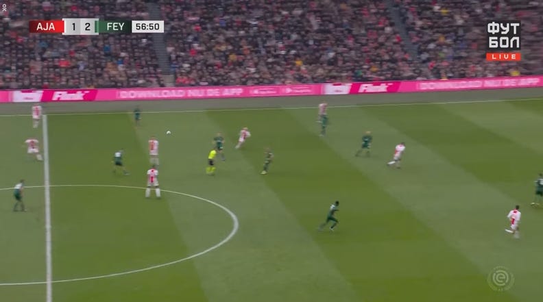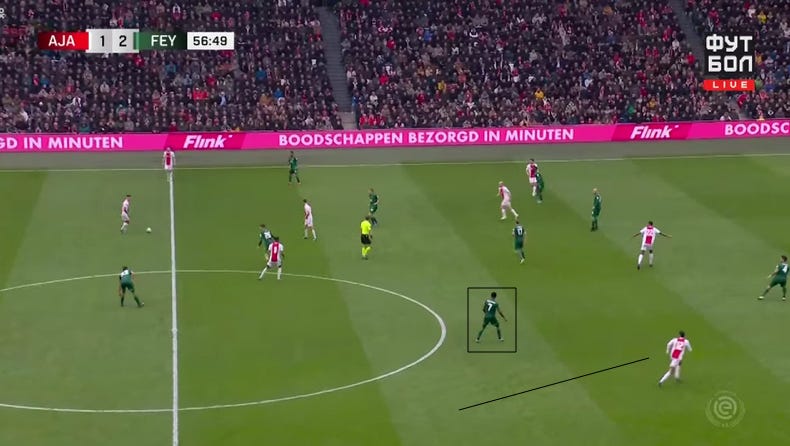 Mazroaui decides against going towards the ball and makes a blind side run, not only does he occupy the winger in buildup but is also given license to join the attack.