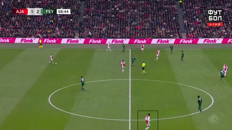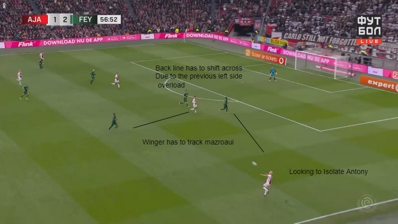 Erik Ten Hag of Ajax Amsterdam uses similar solutions to create actions that divide the backline of defending oppositions. Noussair Mazraoui finds himself in a similar role as Josip Stanišić but with a different goal . Ajax do a lot of left sided overloads and look to isolate Antony, Mazroaui's role is to facilitate Antony's importance in the side by isolating him on the opposite flank.